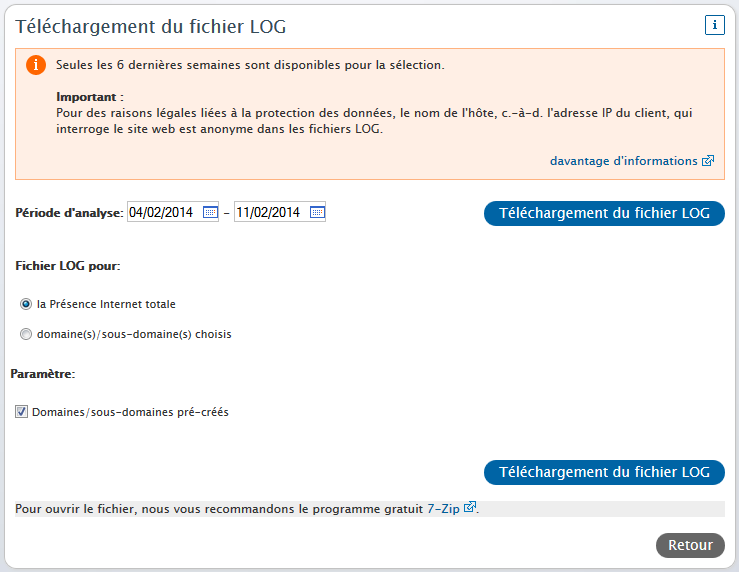 Grâce au Sélecteur de dates (Datepicker), vous pouvez définir précisément la période couverte par les fichiers LOG.