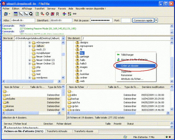 Vous avez également la possibilité de créer des répertoires sur le serveur pour organiser vos fichiers. Pour cela cliquer-droit dans la partie Site Distant et sélectionner Créer un répertoire.