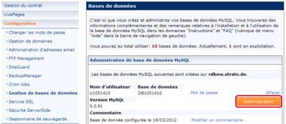 Vous pouvez accéder à l'administration d'une base de données via phpMyAdmin depuis votre espace client protégé par mot de passe. Pour ce faire, veuillez sélectionner le menu "Structure de site Web", puis "Administration des bases de données", et cliquez sur Administration devant la base de données désirée.