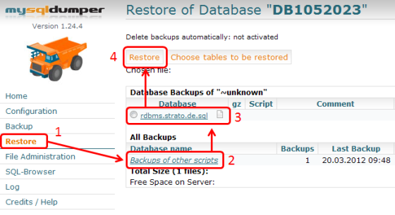 Sélectionner le fichier de sauvegarde que vous venez de télécharger, appelé nomdufichier.sql (3). Enfin, cliquez sur le bouton Restaurer (4).