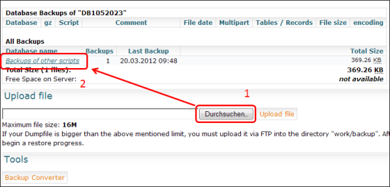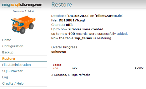 Lors d'une restauration avec phpMyAdmin, la taille du fichier de sauvegarde ne peut pas excéder 2048 Ko. Si vous n'avez pas d'accès SSH, cela limite vos possibilités. Ici, des solutions logicielles telles que MySQLDumper ou backupdb peuvent vous aider. MySQLDumper peut permettre la réinstallation de bases de grandes tailles, en découpant les différentes requêtes selon la taille du cache.