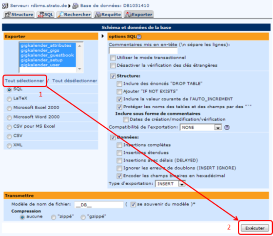 Cliquez sur le bouton Exécuter(2), de sorte que la fenêtre de téléchargement s'ouvre. Sauvegardez votre base de données avec l'extension .sql sur le support de votre choix.