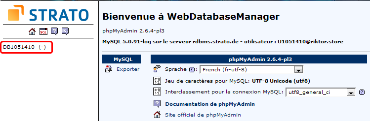 Une fois que vous êtes connecté à la gestion des bases de données dans phpMyAdmin, il vous sera indiqué sur le côté gauche le nom de la base de données. Veuillez cliquer directement sur le nom de la base pour afficher le menu étendu.
