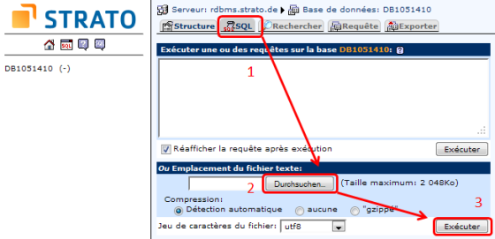 Ensuite, sélectionnez l'onglet SQL dans le menu Avancé (1), puis l'option d'importation de votre fichier de sauvegarde.