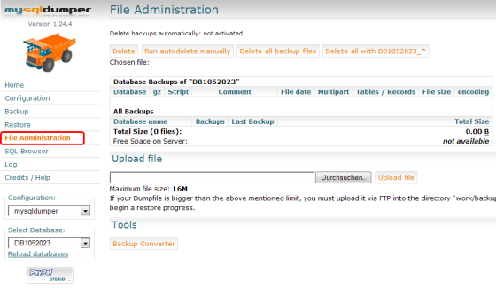Après avoir terminé l'installation et la configuration de MySQLDumper, Veuillez cliquer sur le côté gauche dans le menu sur File Administration.