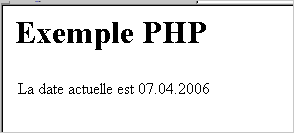 <html> <head> <title>Mon deuxième exemple PHP</title> </head> <body> <h1>Exemple PHP:</h1> La date actuelle est <?PHP echo date("d.m.Y",time()); ?>. </body> </html> Mon deuxième exemple |