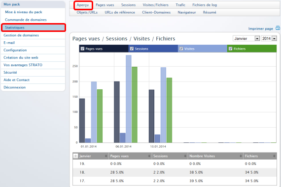 À partir du pack Hosting Basic nous mettons à votre disposition des statistiques exhaustives sur les visites de vos pages. Pour consulter un résumé de tous les accès à votre présence Internet, sélectionnez votre pack dans votre Espace client protégé par un mot de passe puis cliquez sur la rubrique Statistiques.