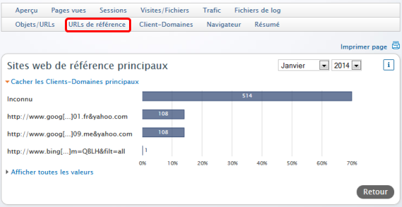 Les URL référentes sont les sites web par le biais desquels l'internaute a atterri sur votre présence Internet. Cliquez sur Afficher toutes les valeurs pour consulter toutes les URL.