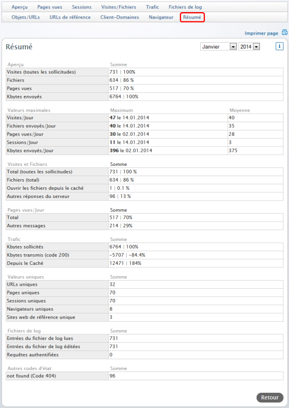 Dans la rubrique Rétrospective, vous bénéficiez d'un résumé des statistiques les plus importantes pour votre présence Internet.