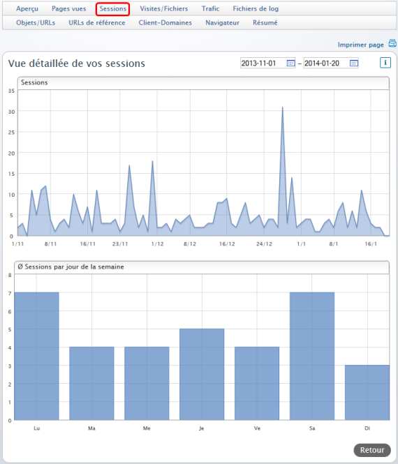 Le terme Sessionsindique combien de domaines différents ont visité votre présence Internet. Dans ce cas, l'accès d'un domaine n'est compté qu'une seule fois par jour.