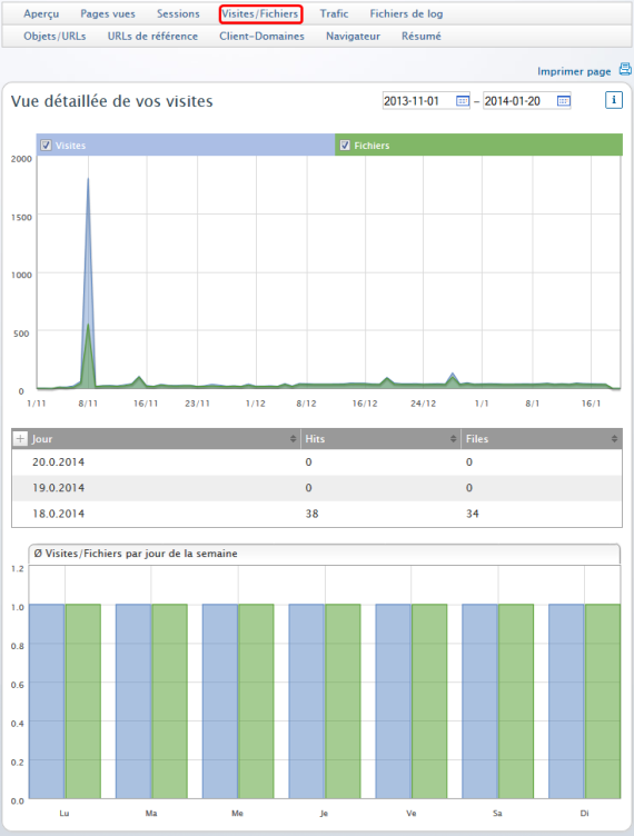 Les fichiers (files) sont des éléments de votre site web, comme des images ou des fichiers texte. Avec le Sélecteur de dates, vous pouvez choisir une période et faire afficher l’analyse pour cette période.