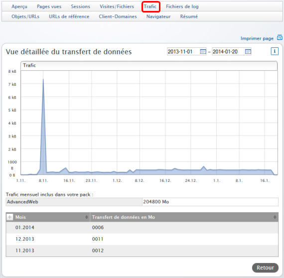 Le Transfert de données indique combien de Ko ont été transférés à partir de votre site. Avec le Sélecteur de dates, vous pouvez choisir une période et afficher l’analyse pour cette période.