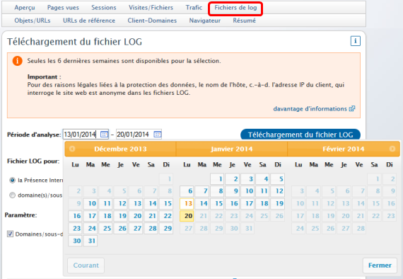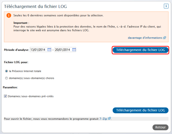 Les fichiers LOG répertorient les accès à vos sites web directement à partir du serveur. Vous pouvez consulter les fichiers LOG en ligne ou les télécharger sur votre ordinateur. Pour ce faire, sélectionnez la période d’analyse souhaitée (les six dernières semaines au maximum) et cliquez sur Téléchargement du fichier LOG.