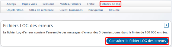 Les logs d'erreur (errorlogs) sont des statistiques sur les accès à vos sites web qui n'ont pas abouti. Ces logs sont surtout intéressants pour le développeur des scripts, pour vérifier le bon fonctionnement de leur exécution. Vous pouvez consulter les fichiers LOG des 24 dernières heures en ligne. Pour ce faire, cliquez sur le bouton Consulter le fichier LOG des erreurs.