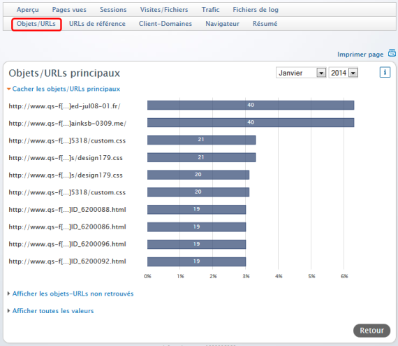 La section Items/URLs vous indique quels éléments (items) ont été visités dans quelle page (URL) de votre présence Internet. En cliquant sur Afficher les Item-URLs introuvables, vous pouvez aussi faire afficher les pages introuvables, comme par exemple, celles qui surviennent après une erreur de saisie. Si vous constatez un nombre important d'erreurs de saisie, vous pouvez, le cas échéant, mettre en place une redirection vers la bonne page.