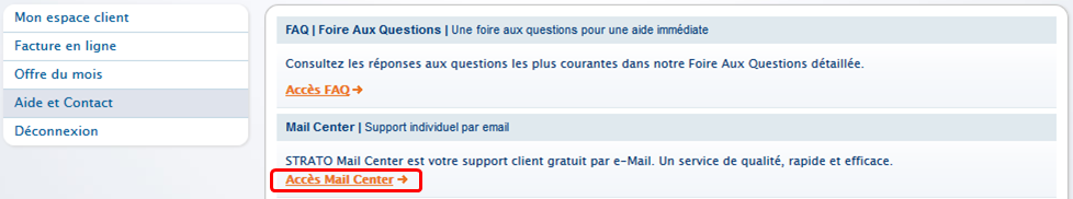 Ouvrez une session dans votre Espace client à l'aide de votre numéro de client et mot de passe, cliquez sur Aide et Contact et sélectionnez Mon pack. Cliquez sur Lancer MailCenter.
