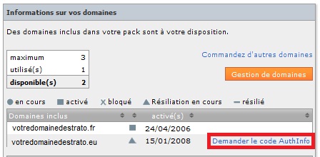 Si votre domaine est résilié avec changement de fournisseur, le AuthCode peut être obtenu en vous connectant à votre espace client. Dans la page "Vue générale de votre pack", un lien "demander le AuthInfo" sera visible devant chaque nom de domaine résilié.