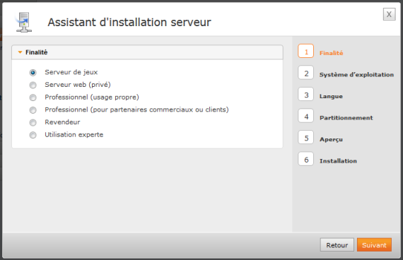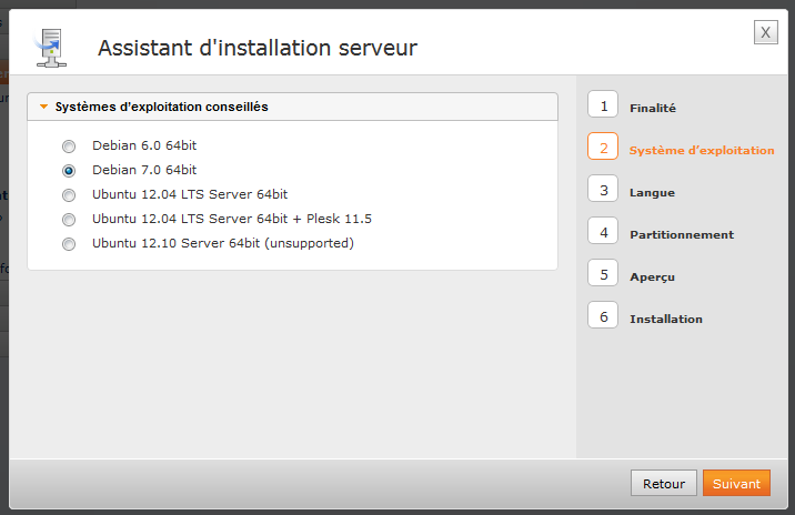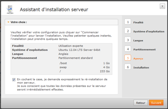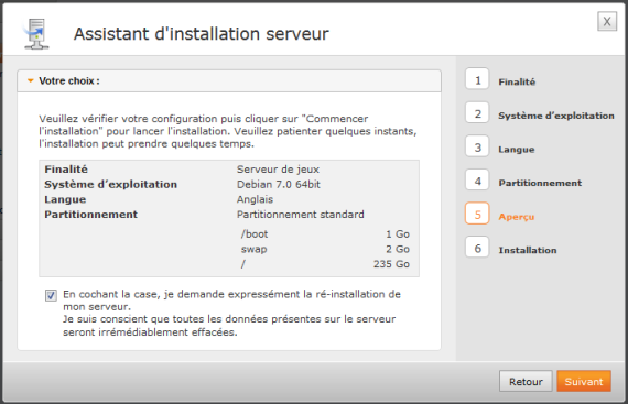 Veuillez choisir dans la liste déroulante le système d'exploitation à installer puis cocher la case pour confirmer la suppression irrévocable sur votre serveur de l'ensemble des données disponibles. Cliquez ensuite sur Suivant.